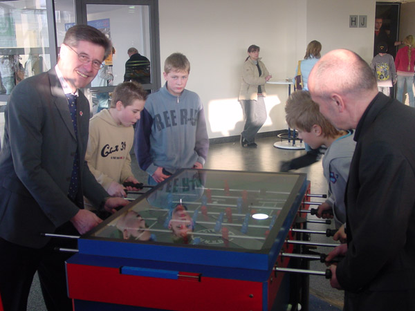 MdL Walter Kern, Willi Haring, Lemgos Bürgermeister Dr. Reiner Austermann und Lippes Landrat Friedel Heuwinkel beim sportlichen Wettbewerb am Football-Unterhaltungsgerät (v.l.n.r.).