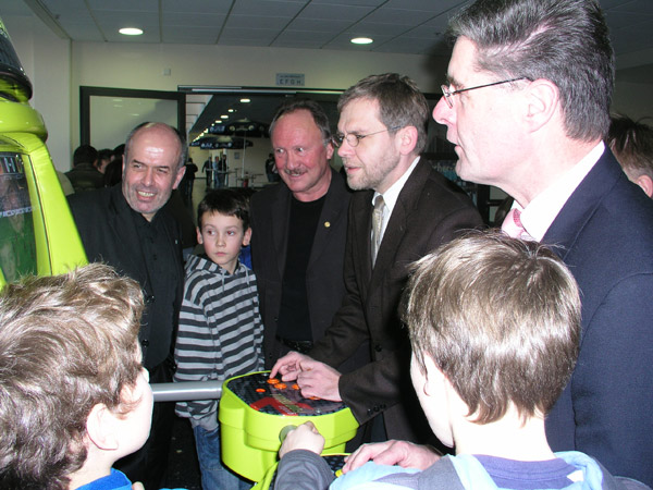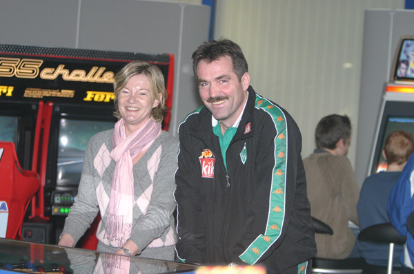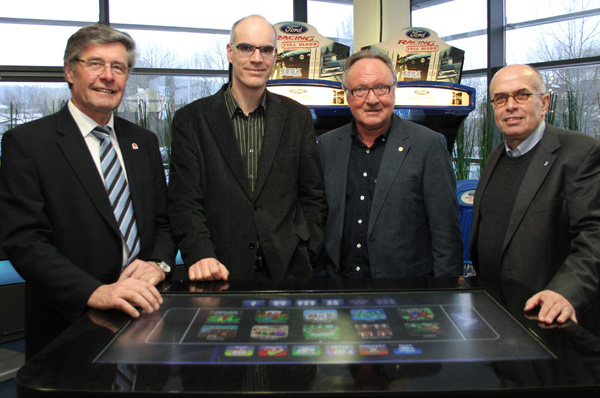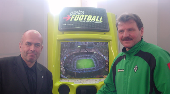 Walter Kern und Ex-Fußballprofi Uli Sude (Borussia Mönchengladbach) vor einem Sport-Unterhaltungsgerät.