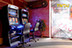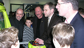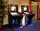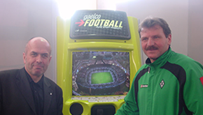 Walter Kern und Ex-Fußballprofi Uli Sude (Borussia Mönchengladbach) vor einem Sport-Unterhaltungsgerät.