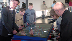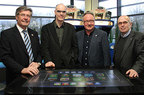 MdL Walter Kern, Willi Haring, Lemgos Bürgermeister Dr. Reiner Austermann und Lippes Landrat Friedel Heuwinkel beim sportlichen Wettbewerb am Football-Unterhaltungsgerät (v.l.n.r.).